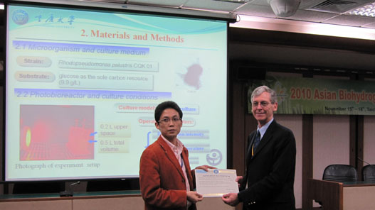 开幕式上逢甲大学校长张保隆代表学校欢迎致辞,国际氢能协会主席Dr. T. Nejat Veziroglu做了特邀报告。会议还邀请了美国宾州州立大学 Bruce Logan教授,印度技术学院 Debabrata Das教授,美国能源部国家可再生能源实验室研究员Dr. Michael Seibert等知名学者做了主题报告。廖强教授作为分会场主席主持了会议。会议期间,王永忠副教授、叶丁丁老师及博士生杨艳霞分别宣读了相关的论文,其它两篇文章则作了张贴报告展示,并且王永忠副教授获得了口头发言二等奖。实验室参会人员还与其他参会学者围绕制氢技术,传热传质及相关领域的热门问题项目进展进行了深入的交流与研讨。会议最后,朱老师参加了由国际氢能协会主席等团体负责人主持的“AHE-Biohydrogen Division Business Meeting”, 并申请2010年由重庆大学工程热物理研究所主办亚洲生物制氢研讨会,与会人员对朱老师提出的在长江三峡大型游轮上举办会议的提议表现出浓厚的兴趣。